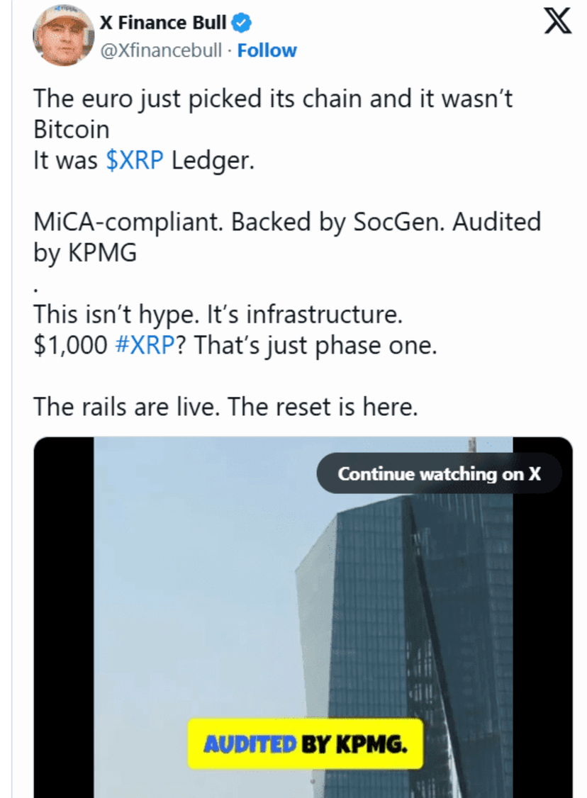 Ein weiterer Analyst, XFinanceBull, ist derselben Meinung. Er weist auf EURØP hin, einen neuen Euro-Stablecoin, der auf dem XRP-Ledger gestartet wird und den MiCA-Vorschriften entspricht — ein starkes Zeichen dafür, dass die XRP-Technologie für regulierte Finanzanwendungen ernst genommen wird.