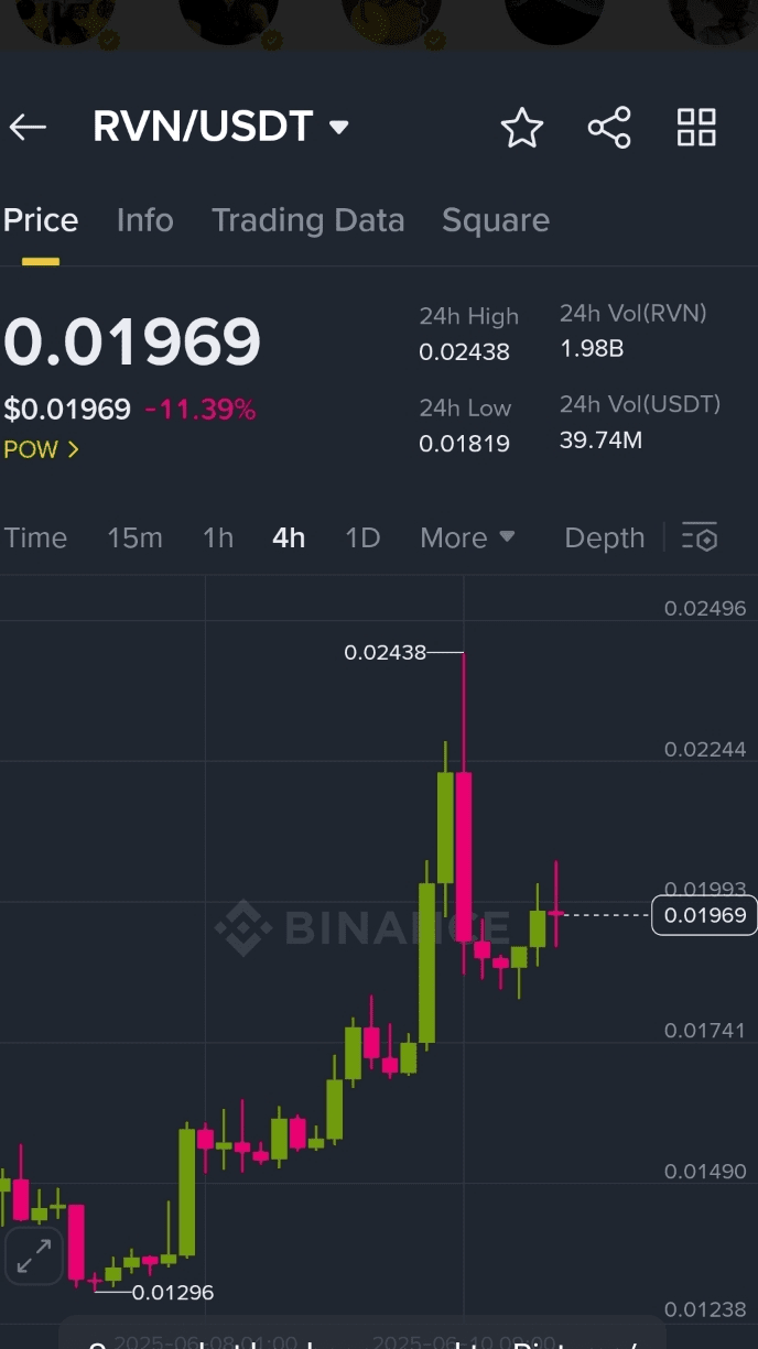 $RVN /USDT wird derzeit bei $0.01969 (-11.39%) gehandelt, nach einem starken Rückgang von seinem 24-Stunden-Hoch von $0.02438. Das Handelsvolumen ist erheblich bei $39.74M USDT, was auf starkes Marktinteresse trotz des jüngsten Rückgangs hinweist.