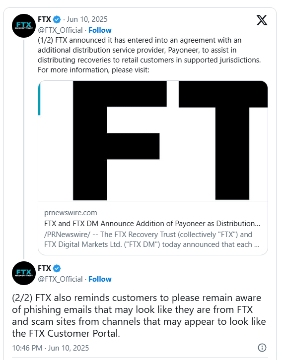 FTX hat Payoneer als Verteiler für Gläubigerauszahlungen nach dem 30. Mai 2025 hinzugefügt.