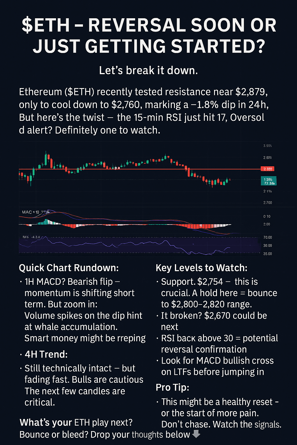 Ethereum ($ETH ) wurde kürzlich bei $2,879 getestet, nur um auf $2,760 abzukühlen, was einen Rückgang von -1,8% in 24h markiert. Aber hier ist die Wendung — der 15-min RSI hat gerade 17 erreicht.