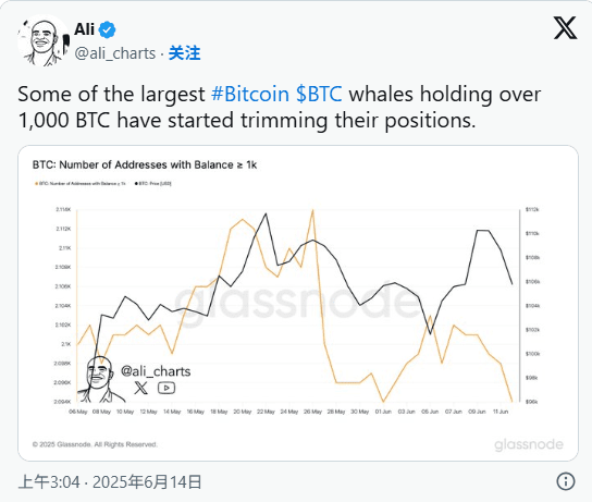 Das erste Warnsignal des Marktes war tatsächlich schon vor dem Ausbruch des Konflikts sichtbar. Ali Martinez zitiert On-Chain-Daten, die zeigen, dass einige 'Wale', die über 1.000 BTC halten, bereits vor dem Vorfall begonnen haben, ihre Bestände zu reduzieren. Obwohl das Volumen noch nicht groß ist, ist der Wandel in der Haltung nicht zu übersehen.
