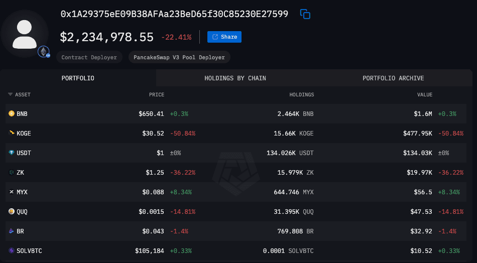 20:30: Abhebung von 33.651 KOGE (~2,07 Millionen USD) und 709.203 ZKJ (~1,38 Millionen USD) aus dem Pool.