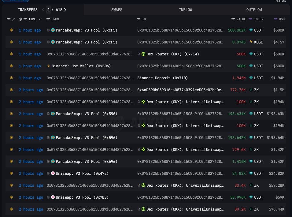 20:28 - 20:36: Tausch von 45.470 KOGE (~3,796 Millionen USD) gegen ZKJ, erzeugt Druck auf KOGE.