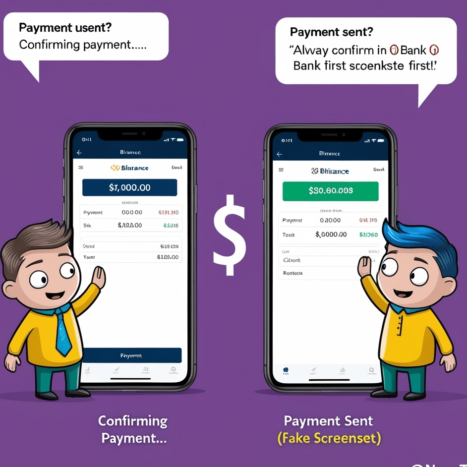 1️⃣ Gib niemals Krypto **frei, bevor du** die Zahlung des Käufers **auf deinem Bankkonto bestätigt hast**, nicht nur Screenshots.