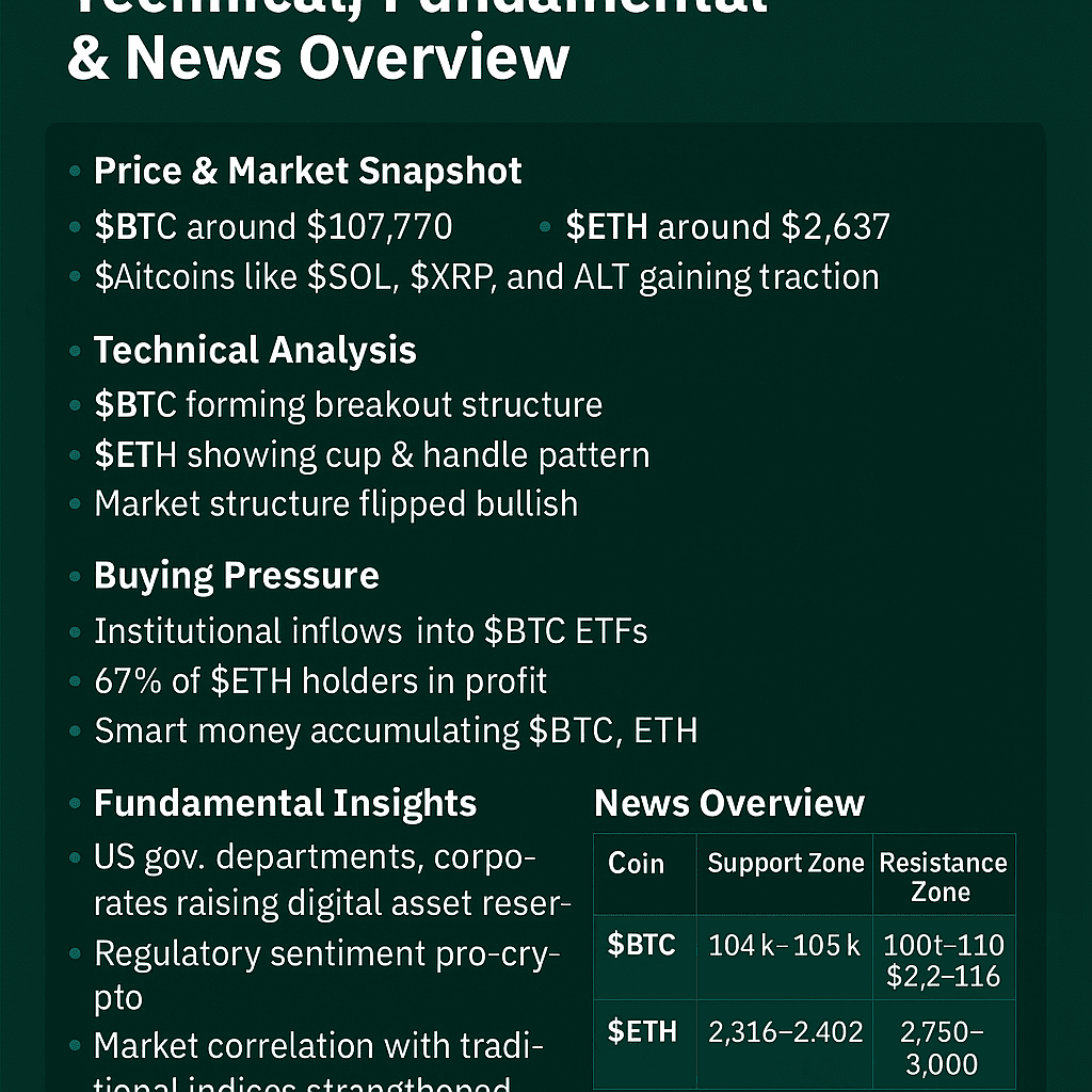 Der Kryptomarkt zeigt weiterhin starken Kaufdruck, angetrieben von sowohl institutionellen als auch privaten Investoren. Hier ist eine schnelle Analyse aus mehreren Perspektiven, die sich auf $BTC, $ETH und $SOL konzentriert.