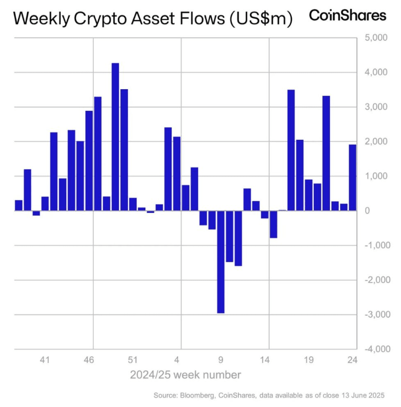 CoinShares malte in einem aktuellen Bericht ein optimistisches Bild und zitierte Daten, die zeigten, dass digitale Anlageprodukte in der letzten Woche $1,9 Milliarden an Zuflüssen angezogen haben, trotz „geopolitischer Bedenken.“ Das ist die neunte Woche in Folge im positiven Bereich und bringt die Jahresbilanz auf coole $13,2 Milliarden.