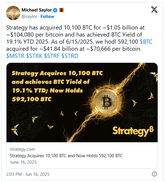 Bei der Untersuchung, warum dieses digitale Asset über dieser psychologisch signifikanten Schwelle geblieben ist, ist es wichtig zu beachten, dass Institutionen in letzter Zeit weiterhin BTC in aggressiven Raten erwerben. Michael Saylor von Strategy war ebenfalls unbeeindruckt – und wie er es an einem Montag normalerweise tut, bestätigte er, dass sein Unternehmen zusätzlich 10.100 Coins gekauft hat… diesmal für $1,05 Milliarden.