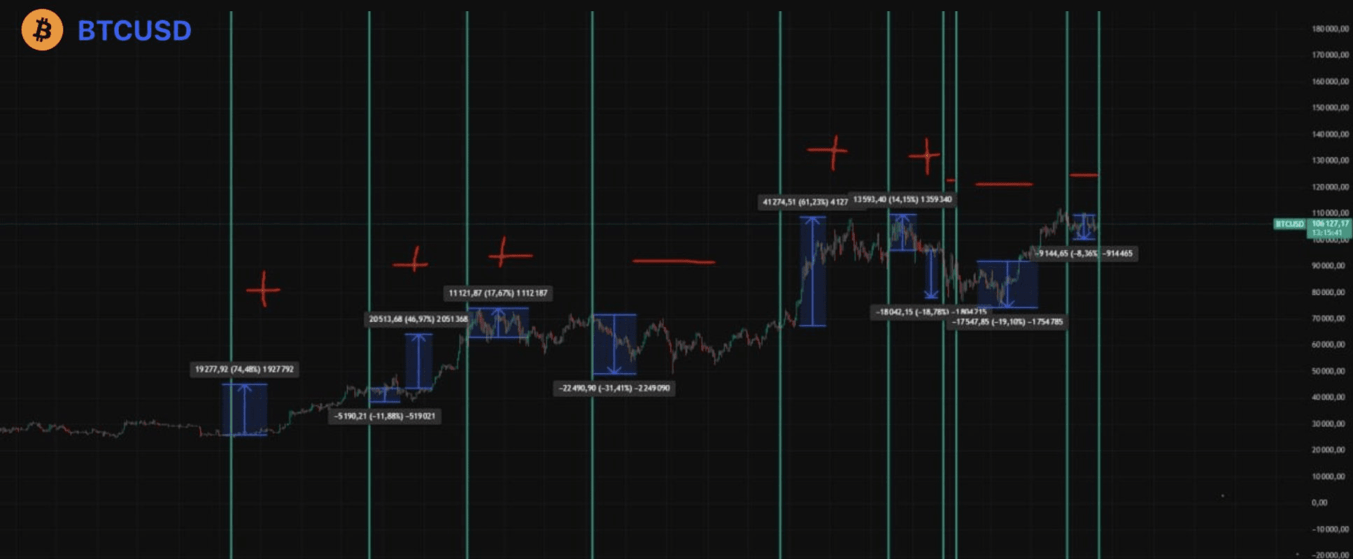 ✦ Für Bitcoin wurden Spitzen von bis zu ±20 % verzeichnet, aber im Durchschnitt ist der Effekt kleiner und weniger konsistent.