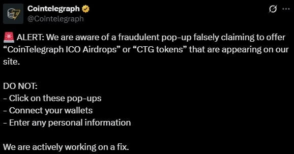 Die beliebte Krypto-Nachrichtenplattform Cointelegraph ist das neueste Ziel einer wachsenden Reihe von Phishing-Angriffen geworden, nachdem Hacker ihre Benutzeroberfläche ausgenutzt haben, um ein gefälschtes Token-Airdrop-Pop-up anzuzeigen. Der Betrug täuschte die Besucher, indem er fast 5.500 Dollar in Token unter dem Vorwand einer „fairen Launch-Initiative“ anbot. Die Nutzer wurden aufgefordert, ihre Krypto-Wallets zu verbinden, nur um dann ihrer Gelder beraubt zu werden. Cointelegraph gab schnell eine Warnung auf X heraus und forderte die Leser auf, nicht auf das Pop-up zu klicken oder persönliche Informationen zu teilen. 🚨💸