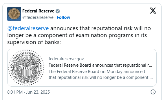 Die Fed beendet die Taktiken von ‘Operation Chokepoint 2.0’ mit einer Reform des Reputationsrisikos.