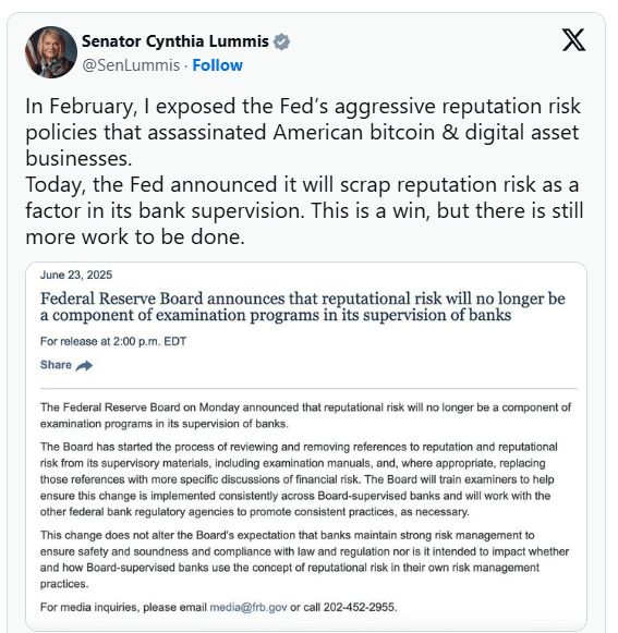 Die Entscheidung erfolgt nach Jahren, die einige als “Operation Chokepoint 2.0” beschrieben haben, eine Zeit, in der mehr als 30 Krypto- und Fintech-Unternehmen berichteten, von Bankdienstleistungen abgeschnitten worden zu sein.