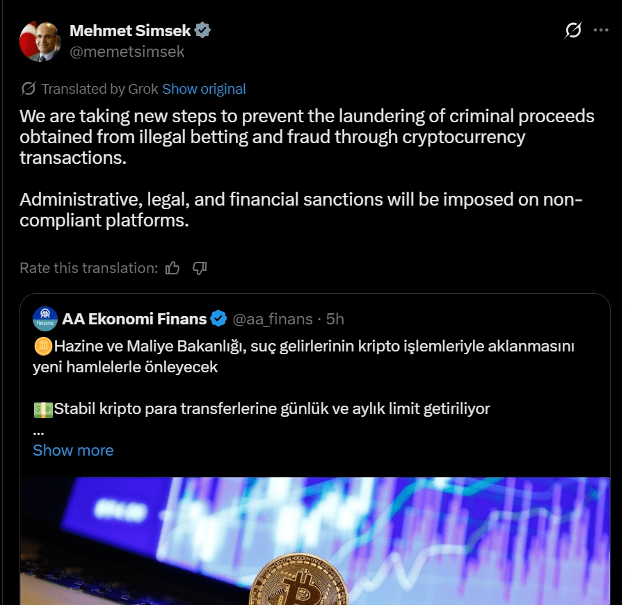 „Wir wollen legale Krypto-Aktivitäten nicht behindern“, erklärte Şimşek. „Unser Ziel ist es, den Missbrauch von Kryptowährungen für kriminelle Zwecke zu begrenzen und eine sicherere und transparentere Umgebung zu schaffen.“
