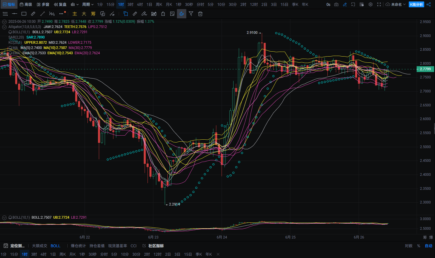 Strukturanalyse: Aus der 4H-Ansicht betrachtet, hat sich SUI seit 2.29 langsam nach oben bewegt und steht stabil über mehreren kurzfristigen gleitenden Durchschnitten. Aber der Widerstand bei 3.00 ist deutlich, und die mittlere Bollinger-Band-Position übt weiterhin Druck auf den Preis aus.