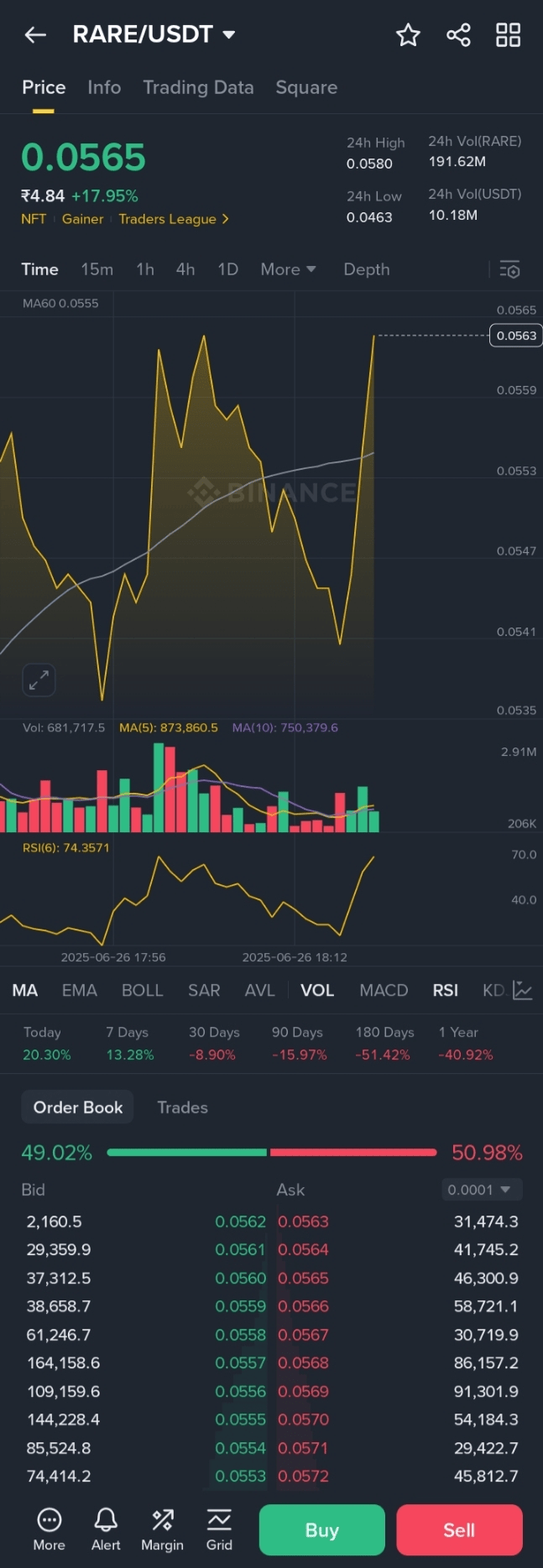 RARE handelt um \$0,056, heute um \~17% gestiegen, schwankt zwischen ca. \$0,046–\$0,057.
