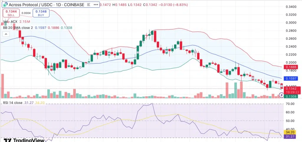 Die Charts sind düster. ACX schwebt nahe der unteren Bollinger-Band bei $0,1308, weit unter dem 20-tägigen einfachen gleitenden Durchschnitt von $0,1597. Der Relative Strength Index (RSI) ist auf 31,27 gefallen und flirtet mit der überverkauften Zone.