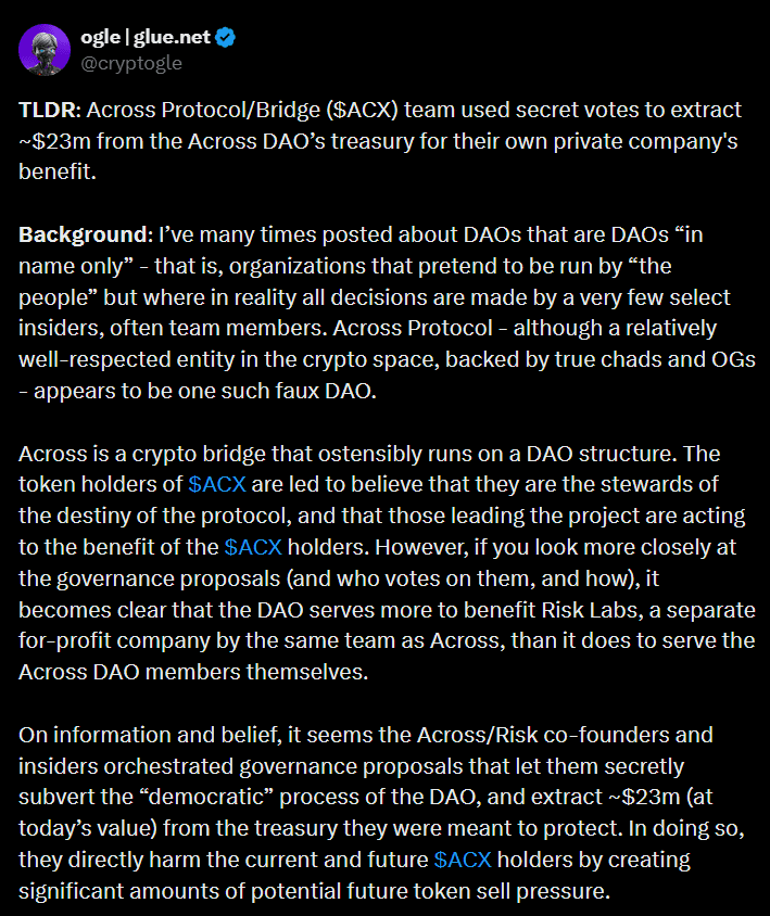 Der Skandal wurde von Ogle, einem pseudonymen Gründer von Layer 1 Glue, ausgelöst, der einen viralen Thread auf X veröffentlichte, in dem er die Führungskräfte von Across Protocol – insbesondere Kevin Chan und CEO Hart Lambur – beschuldigte, zwei geheime Vorschläge orchestriert zu haben, die direkt ihrem eigenen Unternehmen, Risk Labs, zugutekamen.