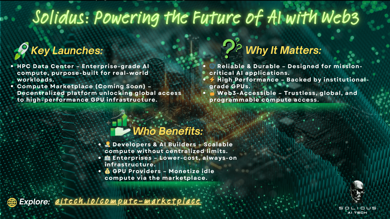 Mit dem Start seines Web3-betriebenen Hochleistungsrechenzentrums (HPC) hat Solidus offiziell eine neue Ära eingeläutet. Und es geht nicht nur um Leistung – es geht um Zugang, Zuverlässigkeit und den Aufbau des digitalen Rückgrats für die anspruchsvollsten KI-Anwendungen von morgen.