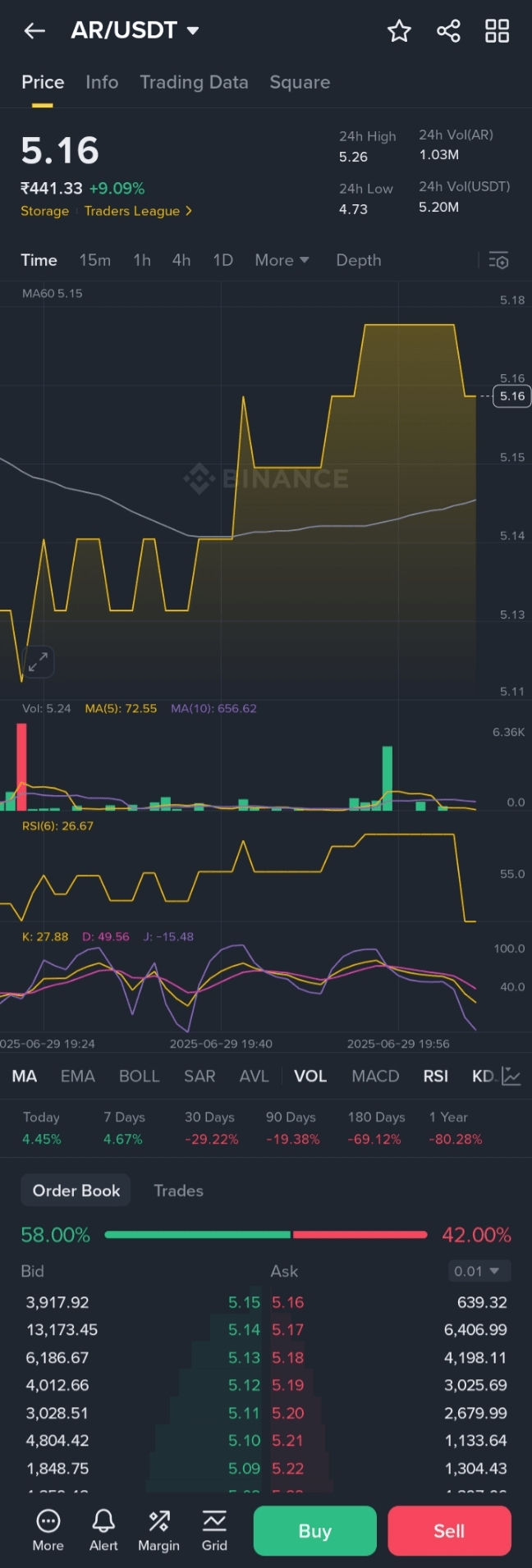 Das Intraday-Hoch liegt bei 5,24 USD und das Intraday-Tief bei 4,73 USD.