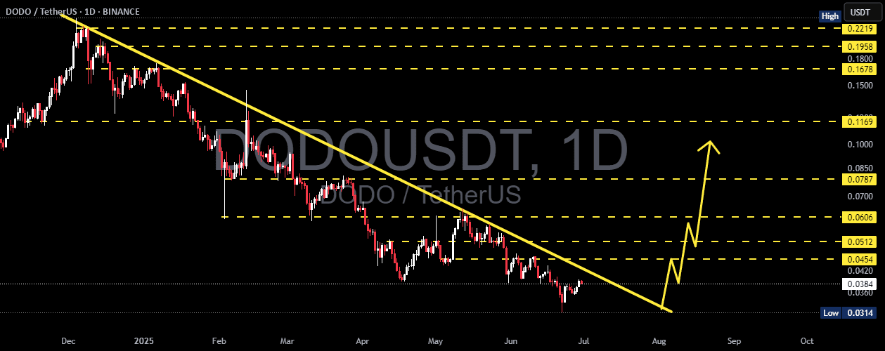 Das DODO/USDT-Paar befindet sich seit Ende 2024 in einem mittelfristigen bis langfristigen Abwärtstrend. Die aktuelle Preisbewegung zeigt jedoch frühe Anzeichen einer möglichen Umkehr.