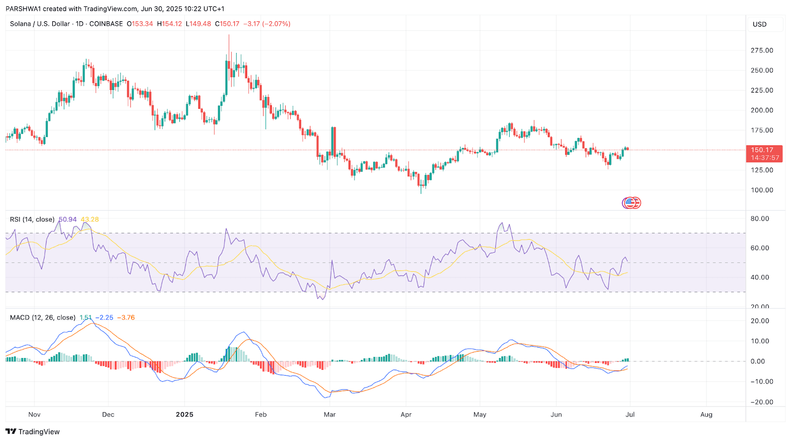 Bis Ende Juni näherten sich die Preise von Solana (SOL) 150 USD, nachdem sie sich von einem lokalen Tiefpunkt von etwa 136 USD zu Beginn des Monats erholt hatten. Obwohl der aktuelle SOL-Preis auf gewisse Widerstände stößt, könnten die kommenden Tage entscheidend für die Richtung sein. Derzeit befindet sich SOL in einer symmetrischen Dreiecks-Kompressionsstruktur, und ein Durchbruch könnte den Angriff auf historische Höchststände einleiten.