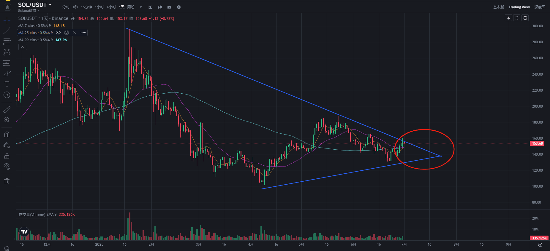 Aus technischer Sicht hat sich die Preisstruktur von Solana zu einem symmetrischen Dreiecks-Kompressionsmuster auf dem Tageschart entwickelt. Die Abwärtswiderstandsniveaus seit dem Höchststand im März und die Aufwärtsunterstützungsniveaus seit dem Tiefpunkt im April konvergieren im Bereich von 150 USD bis 153 USD, und dieser Preis wird ein entscheidender Punkt für den kurzfristigen Trend von SOL sein.
