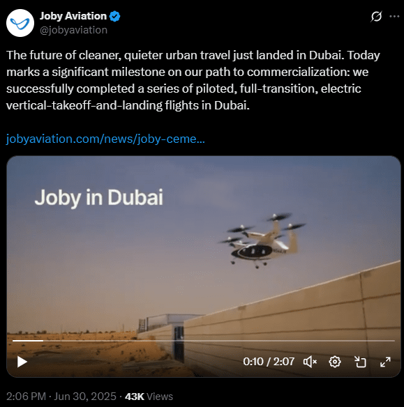 🔹 Joby beginnt mit geflogenen Testflügen in Dubai