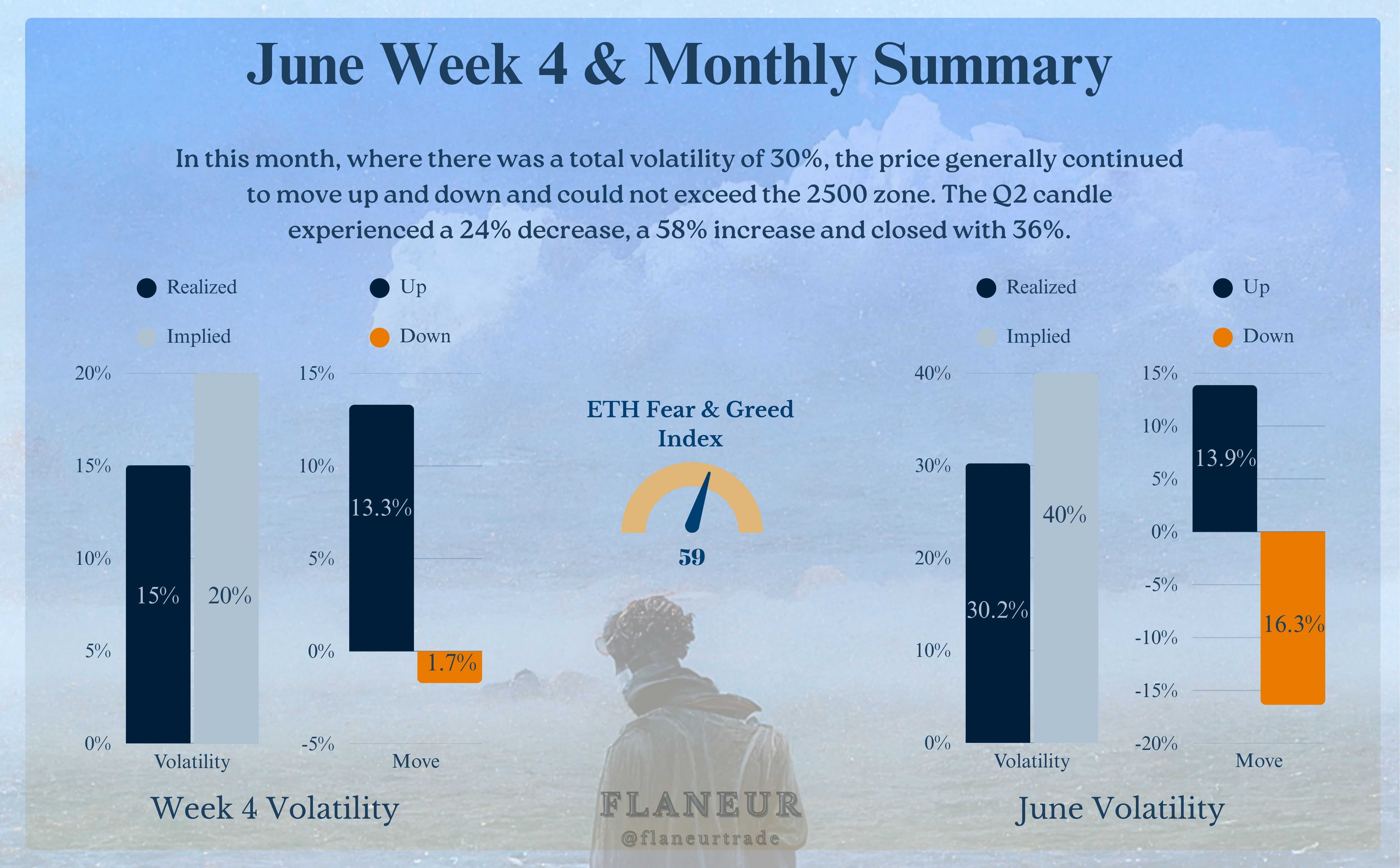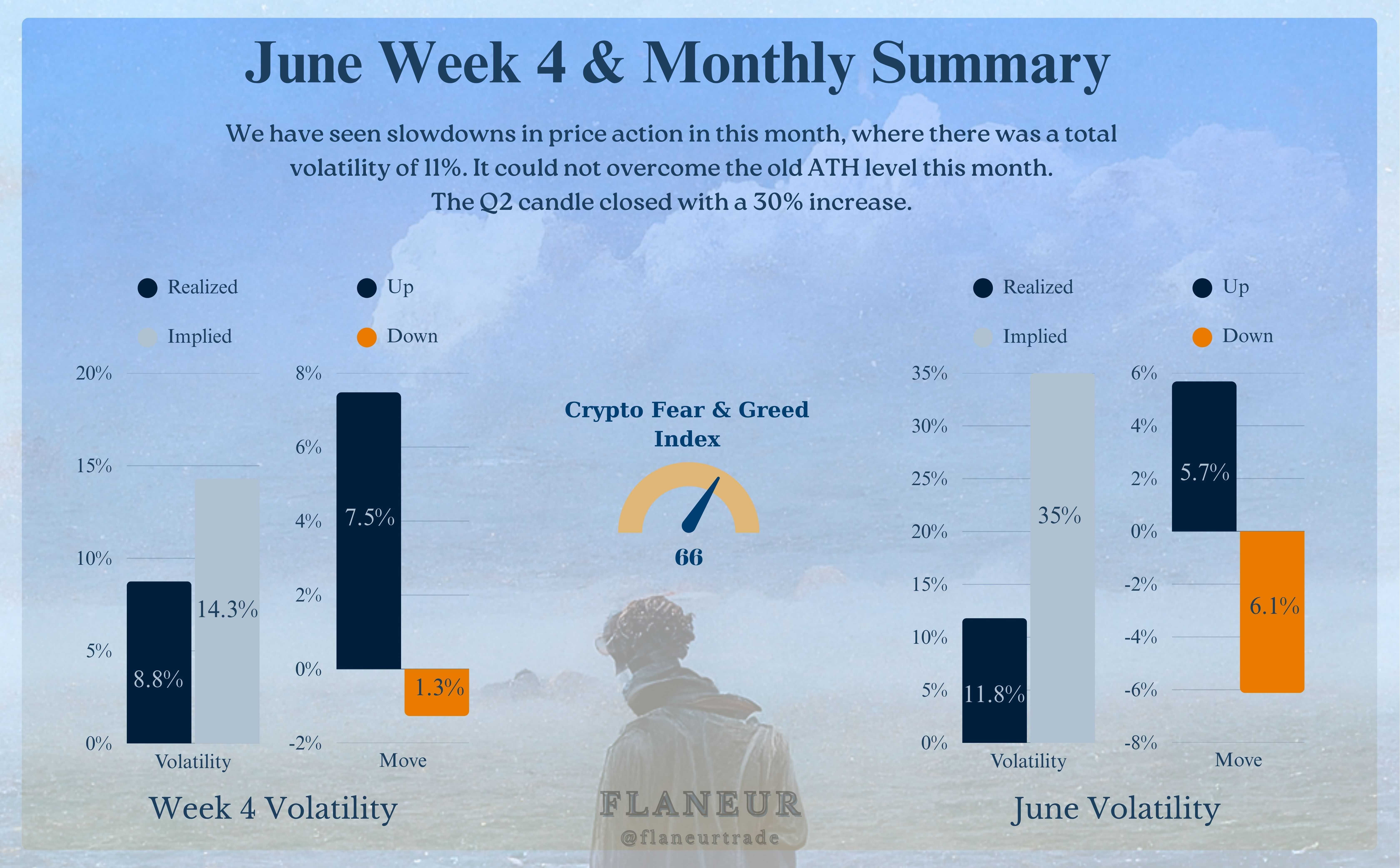 BTC hatte einen relativ ruhigen Juni mit einer Gesamtvolatilität von 11 % und konnte sein vorheriges Allzeithoch (ATH) nicht durchbrechen. Dennoch zeigt der Abschluss des Q2 mit einem Gewinn von 30 %, dass seine mittelfristige Stärke intakt bleibt.