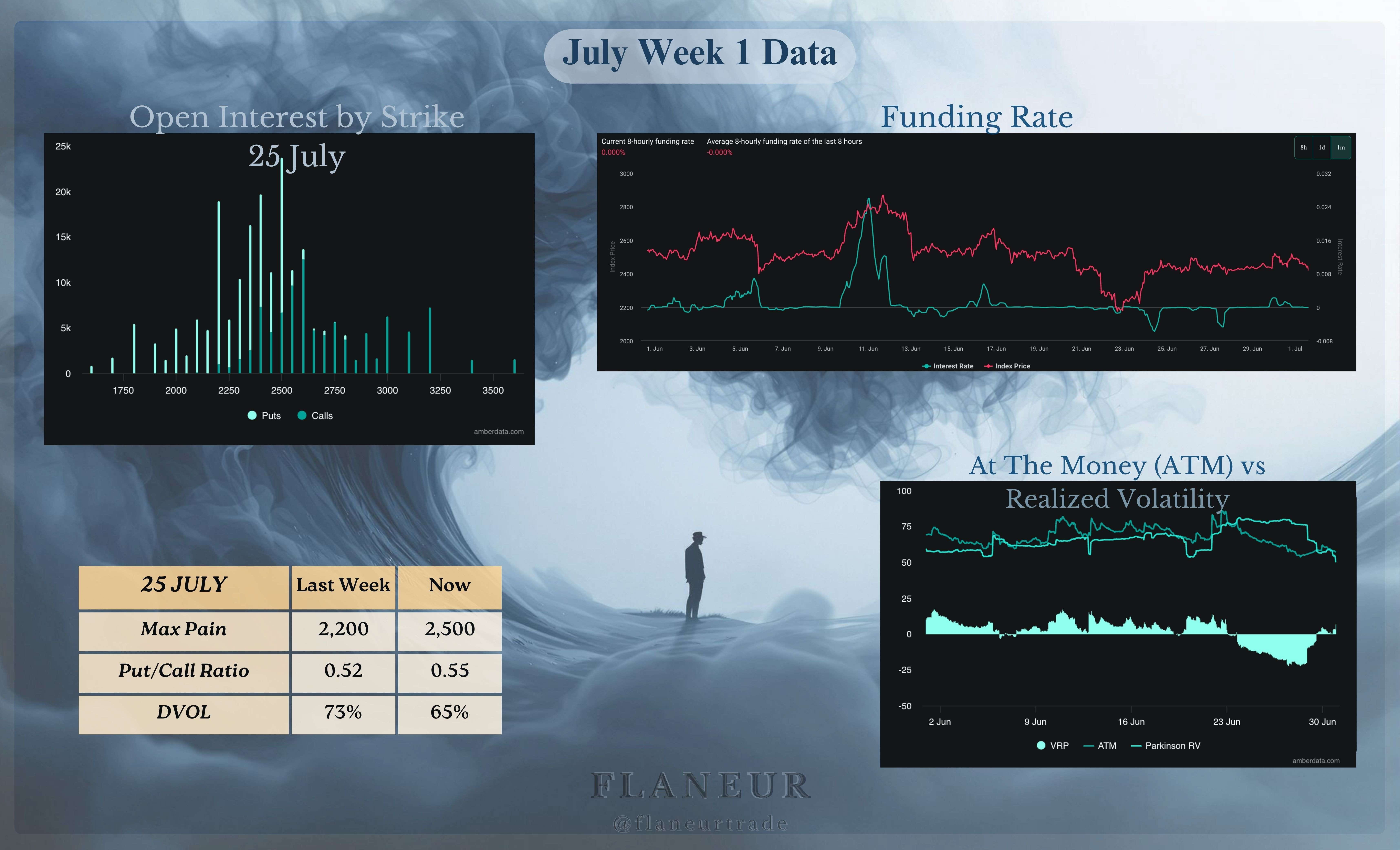 Die monatliche implizierte Volatilität von 28,5 % gibt uns einen Preisbereich von 76,5k $ - 138k $, während die wöchentliche implizierte Volatilität von 12,5 % auf einen Bereich von 95k $ - 122k $ hinweist. Wir können den Bereich von 103k $ - 104k $ als Pivotzone für diesen Monat identifizieren und den Bereich von 97k $ - 98k $ als Pivot für das Q3.