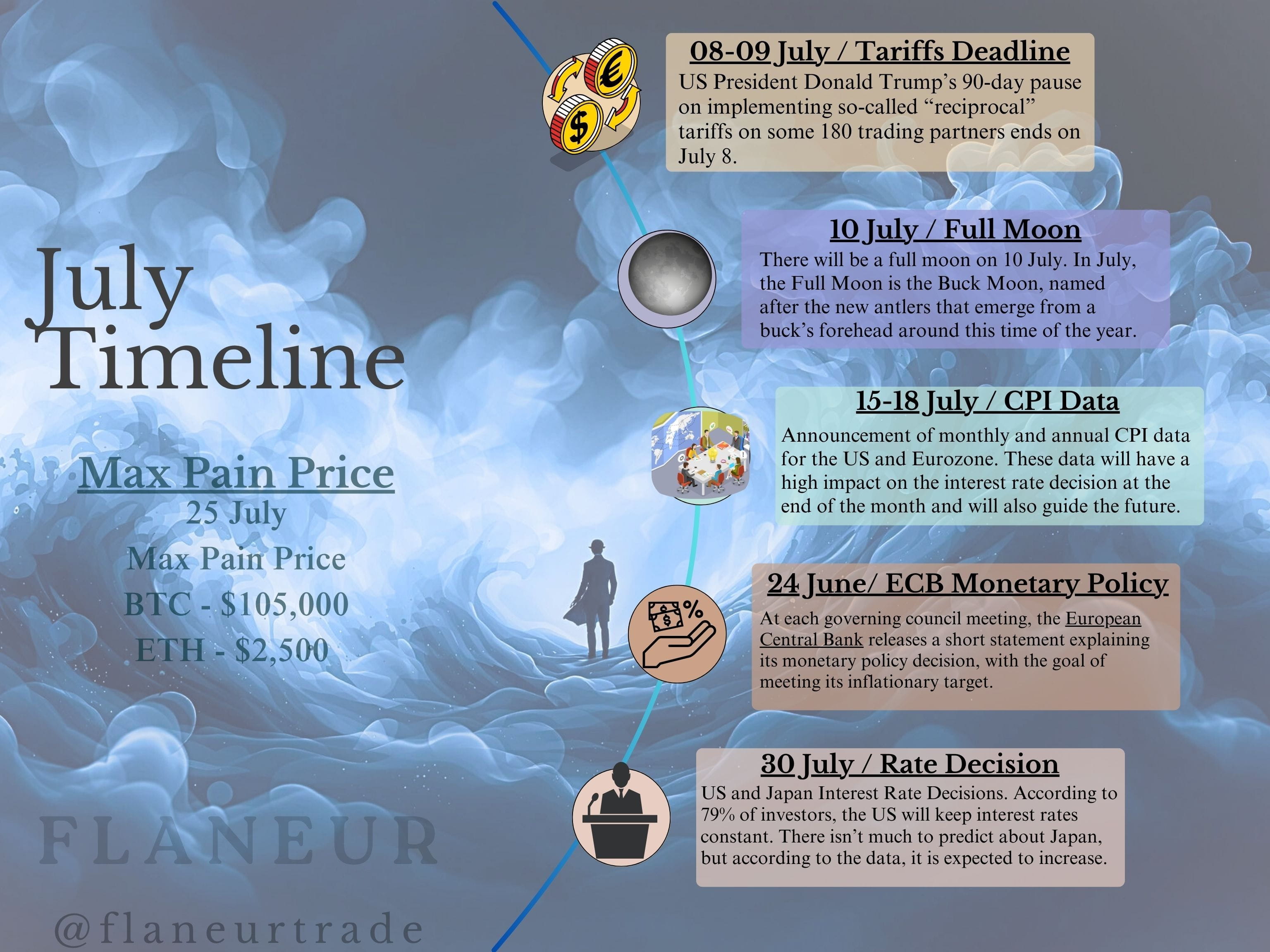 Direkt zu Beginn des Monats, am 8.-9. Juli, endet die 90-tägige Pause der USA bei der Umsetzung sogenannter "gegenseitiger" Zölle auf 180 Handelspartner. Dies könnte Spannungen auf den globalen Märkten erzeugen. Die CPI-Daten der USA und der Eurozone, die zwischen dem 15. und 18. Juli veröffentlicht werden, werden eines der kritischsten Ereignisse des Monats sein, die direkt die zukünftigen Zinspolitikentscheidungen der Zentralbanken beeinflussen. Am Ende des Monats, am 30. Juli, werden wir die Zinsentscheidungen aus den USA und Japan beobachten. Eine erwartete Zinserhöhung aus Japan könnte insbesondere eine neue Welle von Volatilität auf den Märkten auslösen.