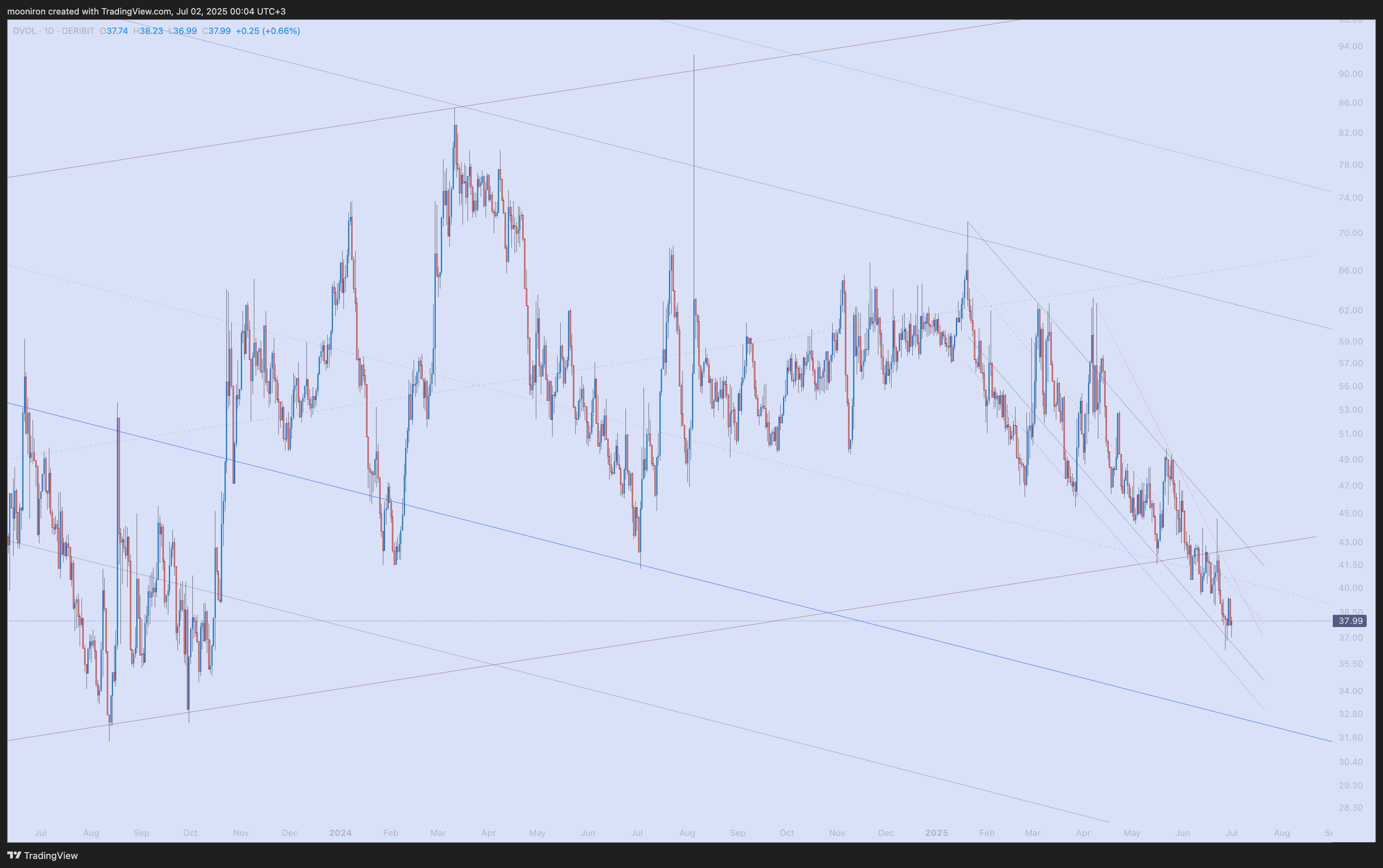 DVOL (Derivative Volatility) ist von 42 % auf 38 % gefallen. Obwohl dies darauf hindeutet, dass die Erwartung an niedrige Volatilität möglicherweise weitergeht, werde ich später mehr dazu sagen.