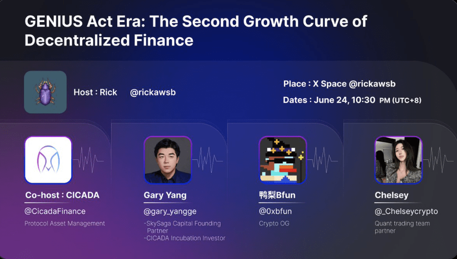 Das Genius-Gesetz wurde verabschiedet, kommt DeFis zweite Wachstumsphase? Moderiert von Rick @rickawsb, beinhaltete die Diskussion Schlüsselmeinungsführer wie Gary @gary_yangge, Inkubationsinvestor von Cicada Finance, neben Web3-Influencern Yali @0xbfun und Chelsey @_Chelsey404. Das Gespräch erkundete das transformative Potenzial des kürzlich verabschiedeten Genius-Gesetzes, das Aufkommen von Stablecoins und DeFis "zweite Wachstumsphase" mit Implikationen für innovative Plattformen wie Cicada Finance. Dieser Rückblick hebt wichtige Einblicke für das Krypto-DeFi-Publikum hervor und unterstreicht, wie Cicada Finance positioniert ist, um von diesen Entwicklungen zu profitieren.