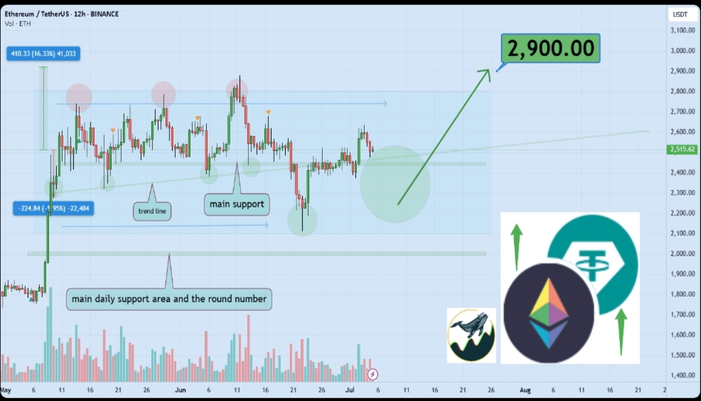 ETHUSDT handelt derzeit innerhalb eines gut definierten parallelen Kanals. Es nĂ€hert sich einem wichtigen tĂ€glichen UnterstĂŒtzungsniveau, das mit einer wichtigen aufsteigenden Trendlinie ĂŒbereinstimmt. Ein Ausbruch ĂŒber diesen Kanal könnte zu einer bullischen Bewegung fĂŒhren, die mindestens eine Gewinnspanne von 16 % mit einer primĂ€ren Widerstandszone nahe $2900 anvisiert. Zu ĂŒberwachen, wie der Preis in diesem Bereich reagiert, wird entscheidend sein, um das nĂ€chste Bein nach oben zu bestĂ€tigen.