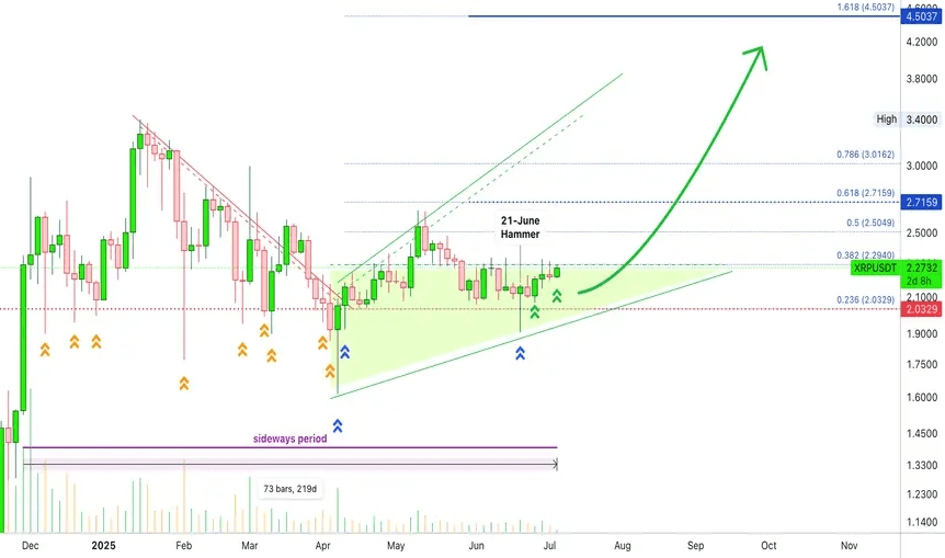 Dieses Niveau wurde 12 Mal getestet, zuletzt am 21. Juni, wo XRP einen bullischen Hammer gedruckt hat — eine starke Bestätigung, dass $2 jetzt eine solide Unterstützung ist.