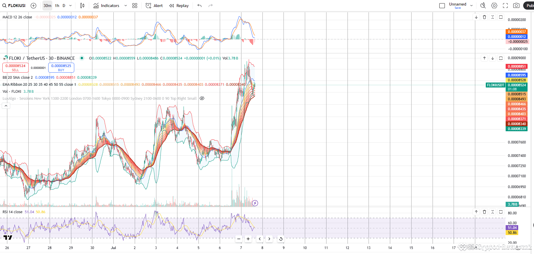 As we can see that FLOKIUSDT has already increased a lot. It has reached it's supply zone. It is the resistance of this price. Now it needs to cool down by meeting it's demand zone or OB. I have analyze this chart from Daily timeframe to 30min frame. We can also see that it is breaking the support of EMA RIBBON. So that means there will be a fall on this coin. And we also know that Bitcoin is bearish. A small bearish movement of Bitcoin can create a strong bearish movement on ALTS coin. MACD has already created SHORTS. That means it highly bearish. We can also see a strong bearish candle on volumes. The upper line of Bollinger bands is also curving towards down. So we can go short on this coin.
