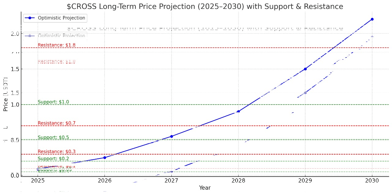 Langfristige Preisprognose: Analysten bleiben optimistisch bezüglich potenzieller Gewinne, wenn CROSS liefert. Zum Beispiel prognostiziert eine CryptoTicker-Vorhersage (unter Verwendung von chartbasierter Modellierung), dass CROSS bis Ende 2025 einen Durchschnitt von ~$0,15, ~$0,19 im Jahr 2026, auf etwa $0,59 bis 2029 und ~$0,87 bis 2030 steigen könnte. Noch optimistischer sehen einige CROSS schließlich über $1 steigen, wenn Web3-Gaming wirklich durchstartet. Dies sind hypothetische Szenarien; tatsächliche Ergebnisse hängen von vielen Faktoren ab.