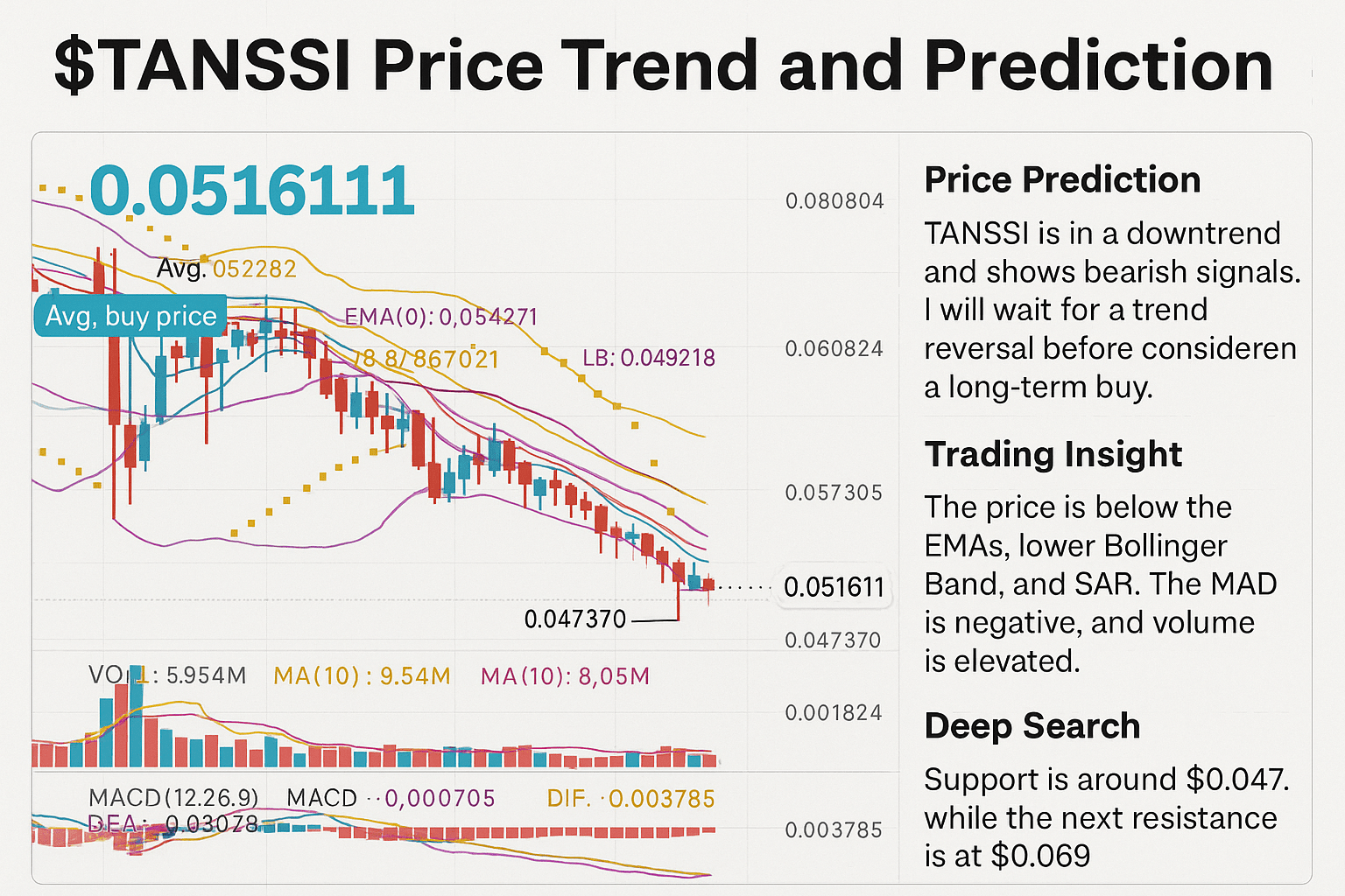 Kurzfristige Aussichten: Kurzfristig könnte TANSSI von extrem überverkauften Bedingungen profitieren – zum Beispiel eine Rallye in Richtung des mittleren Bollinger-Bandes oder $0,055–$0,06 – insbesondere wenn das Verkaufsvolumen abnimmt. Dennoch bleiben die dominierenden Signale bärisch. Der MACD müsste über seine Signallinie oder Nulllinie kreuzen, um einen neuen Aufwärtstrend zu bestätigen, und der SAR müsste unter den Preis wechseln, um die Umkehr zu bestätigen. Ohne diese ist weiteres Abwärts wahrscheinlich; ein entscheidender Bruch unter $0,047 könnte tiefere Niveaus (potenziell $0,04 oder psychologische $0,03) anvisieren. Im Gegensatz dazu würde jede anhaltende Bewegung über die kurzfristigen EMAs die Dynamik verschieben. Bemerkenswerterweise prognostiziert eine technische Vorhersage, dass TANSSI bis Ende 2025 bei etwa $0,056–$0,062 liegen könnte, wobei dies eine eventual Rückkehr der Marktstimmung voraussetzt. Derzeit beschreiben Analysten die Aussichten für TANSSI als „bärisch“ für 2025, was den gegenwärtigen Abwärtstrend widerspiegelt.