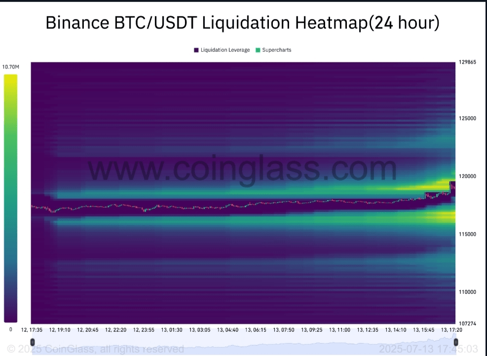 Die neuesten Daten von der Monitoring-Ressource Coin Glass zeigen, dass die Short-BTC-Liquidationen in einer einzigen Stunde über 20 Millionen $ lagen. Es wird nächste Woche interessant. Wir haben eine Menge großer Liquiditätscluster über und unter dem aktuellen Preis. Wir haben gerade einen guten Teil in der Region von 119.000 $+ herausgenommen,” reagierte der beliebte Trader Daan Crypto Trades in einem Post auf Binance. Daan Crypto Trades hat zwei wichtige liquidationsbezogene Zonen im Auge, die zu beobachten sind: 115.500-116.500 $ und den Bereich über 120.000 $.