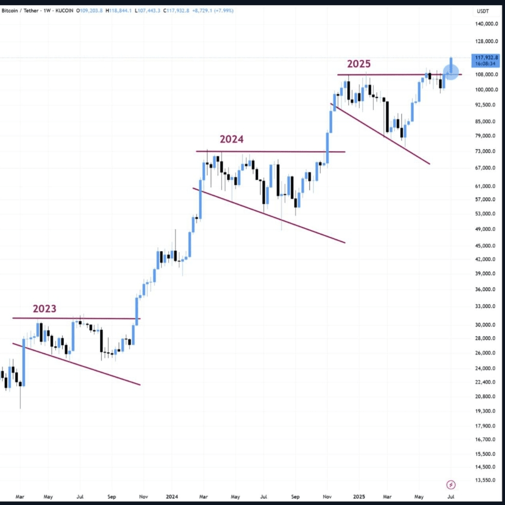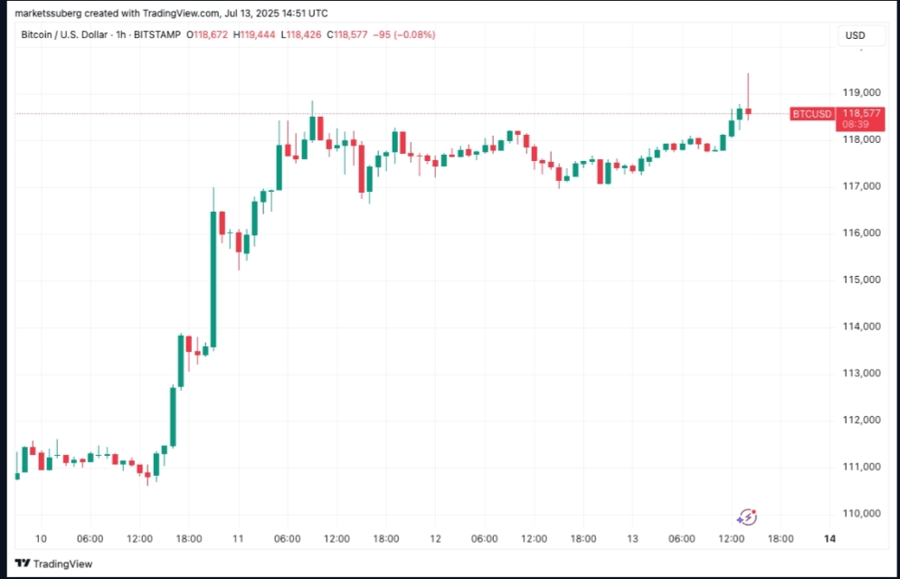 Bitcoin erreicht neuen Allzeithoch über 119.000 $ während Trader den 7-wöchigen Aufwärtstrend im Auge hat