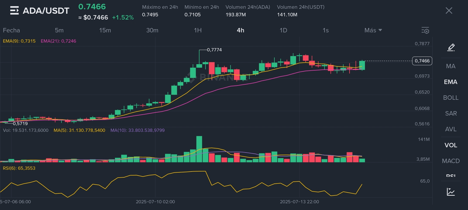Aktueller Preis: ≈ $0.748 (steigend +28 % in der Woche)