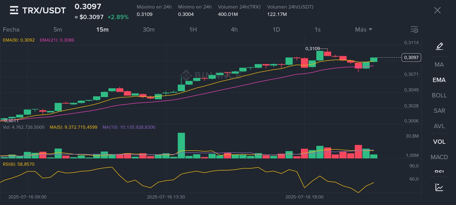 Der aktuelle Preis von TRX liegt bei USD 0.309, mit Tagesfluktuationen zwischen 0.3006 und 0.3109 .