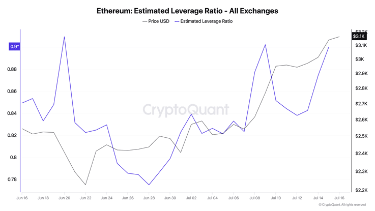 Laut den Daten von CryptoQuant hat das geschätzte Hebelverhältnis (ELR), das das Verhältnis zwischen OI und dem ETH-Saldo an der Börse misst, wieder ein Hoch erreicht. Mit einem Wert von 0,90 ist es nur einen kleinen Abstand vom historischen Höchststand von 0,916 (gesetzt zu Beginn des Monats Juni) entfernt.