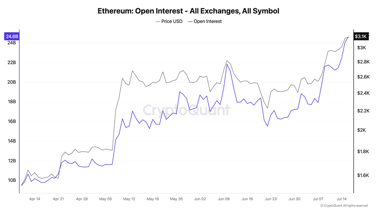 Das gesamte derivativen OI von ETH an allen Börsen hat 24,5 Milliarden Dollar erreicht, ein Anstieg von 37% in nur 30 Tagen. Allein in der vergangenen Woche wurden zusätzlich etwa 2,9 Milliarden Dollar verzeichnet. Der plötzliche Anstieg des OI fand im Kontext eines starken Anstiegs von ETH von unter 2.600 Dollar auf über 3.160 Dollar statt, was zeigt, dass der Markt signifikant spekulatives Kapital anzieht.