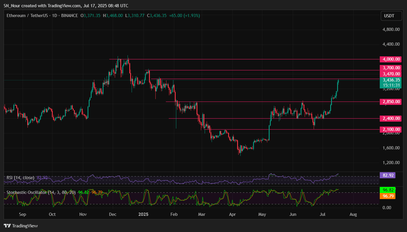 Ethereum (ETH) bricht über $3.400 aus, angetrieben von einer starken Kaufwelle von Unternehmen, die digitale Vermögenswerte halten, sowie von der wachsenden Anziehungskraft sowohl des Spot- als auch des Derivatemarktes.
