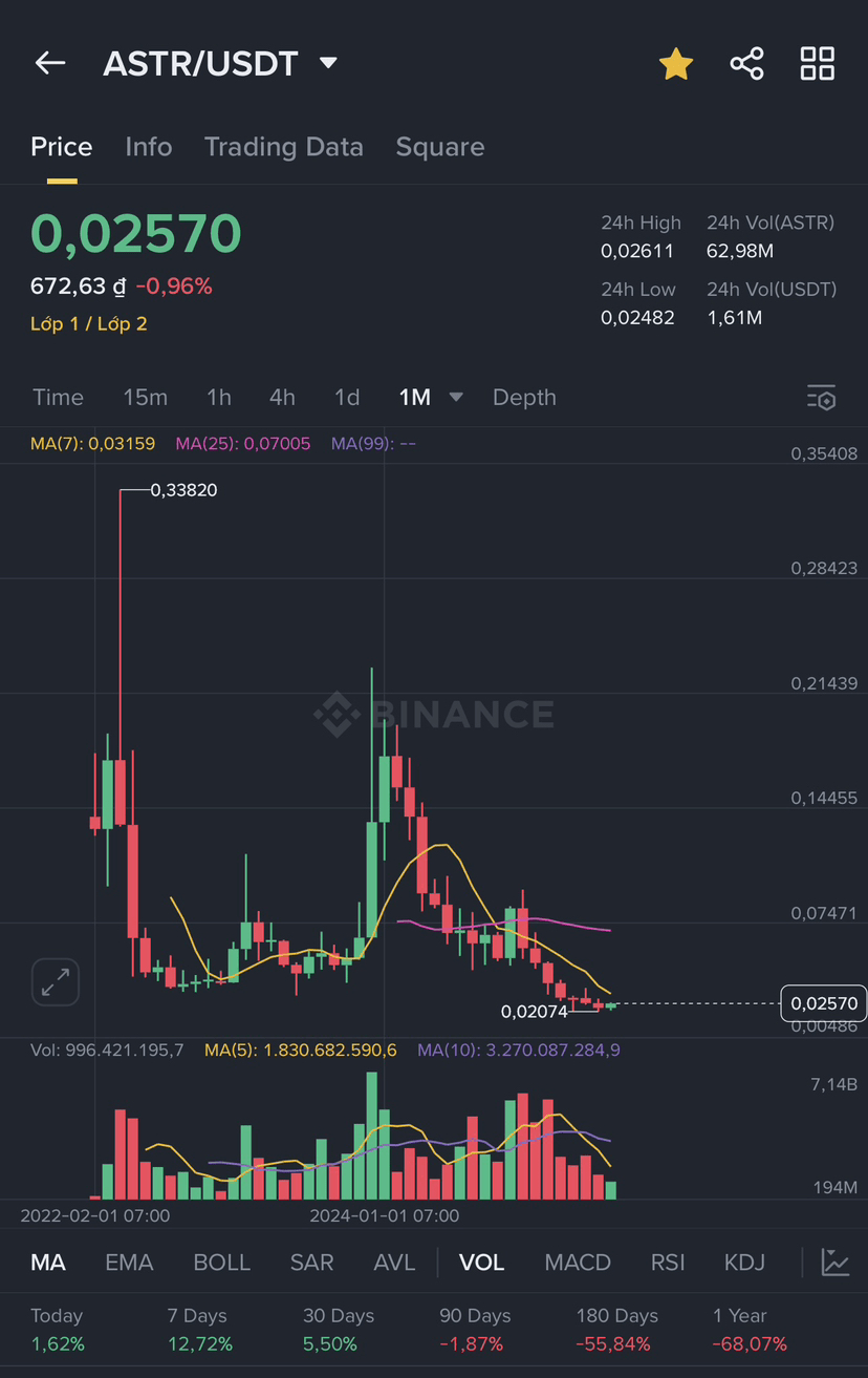 $ASTR ist ein Betrugsprojekt, das das Geld der Investoren stiehlt; diejenigen, die $ASTR seit dem Zeitpunkt gekauft haben, als dieser Token an der Börse Binance gelistet wurde, haben massive Verluste erlitten (der Preis zum Zeitpunkt der Listung lag bei etwa 0,3$, derzeit ist der Wert auf weniger als 0,025$ gefallen). Ich hoffe, dass diejenigen, die neu auf diesem Markt sind, sich von dieser Krypto-Währung $ASTR fernhalten und bitte, meidet auch die Krypto-Projekte von Japanern! Ein abscheuliches Projekt!