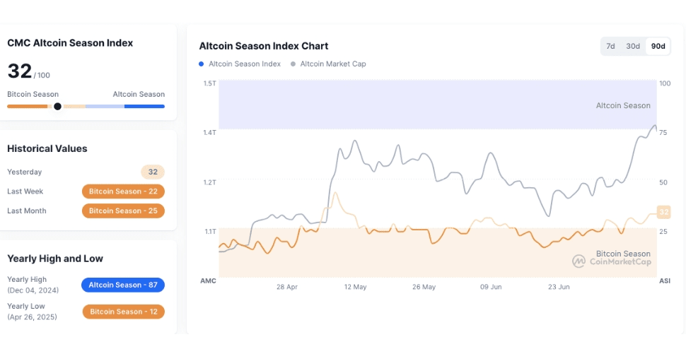 Der Altcoin-Saison-Index bleibt mit 32 niedrig und signalisiert eine anhaltende Dominanz des Bitcoin-Marktes.