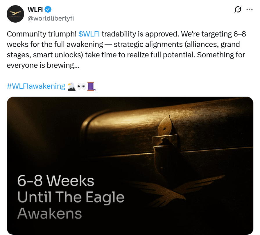 Der Handel soll in sechs bis acht Wochen beginnen, was bedeutet, dass er Ende August starten könnte. "Gemeinschaftssieg! Das Team postete: "$WLFI Handelsfähigkeit ist genehmigt," auf X. Strategische Ausrichtungen (Allianzen, große Bühnen, intelligente Freigaben) brauchen Zeit, um ihre volle Kraft zu entfalten, daher streben wir ein volles Erwachen in 6-8 Wochen an. Es gibt etwas in Arbeit für alle.