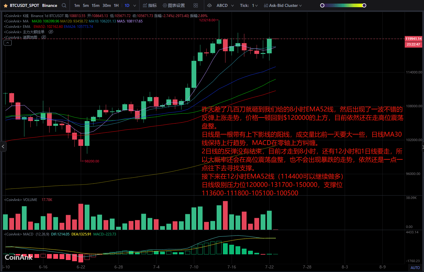 Die Korrektur der 2-Tage-Linie ist noch nicht beendet, wir sind erst bei 8 Stunden, es stehen noch 12 Stunden und 1 Tag an, daher wird es mit großer Wahrscheinlichkeit weiterhin zu einer Konsolidierung auf hohem Niveau kommen, und es wird auch nicht zu einem drastischen Rückgang kommen, wir werden weiterhin schrittweise nach Unterstützung suchen.