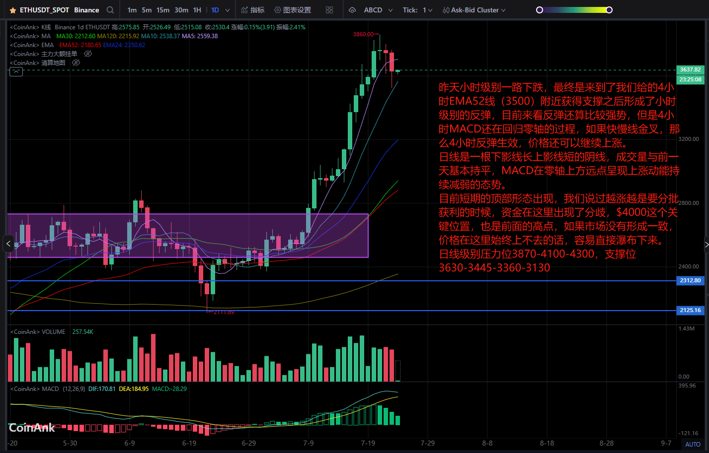 Gestern fiel der Stundenchart kontinuierlich und erreichte schließlich in der Nähe der von uns angegebenen 4-Stunden-EMA52-Linie (3500) Unterstützung, wonach eine Stunden-Rallye begann. Aktuell betrachtet ist die Rallye recht stark, aber der 4-Stunden-MACD befindet sich noch im Rückkehrprozess zur Nulllinie. Wenn die schnellen und langsamen Linien ein Golden Cross bilden, wird die 4-Stunden-Rallye wirksam und der Preis kann weiter steigen.