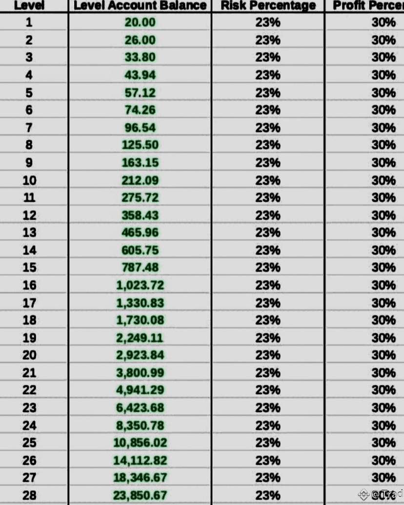Level 1: Beginnen Sie mit $20 → 30% Gewinn = $6 → Neuer Kontostand = $26