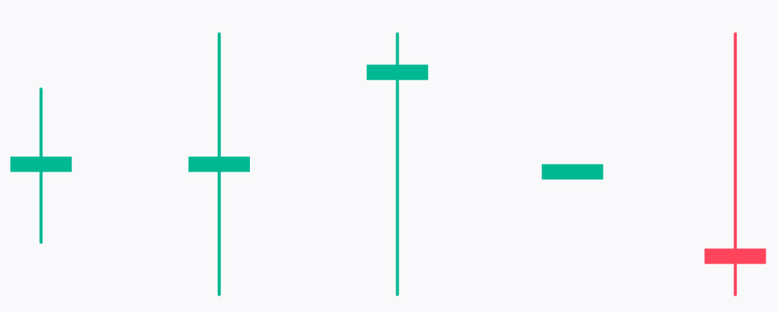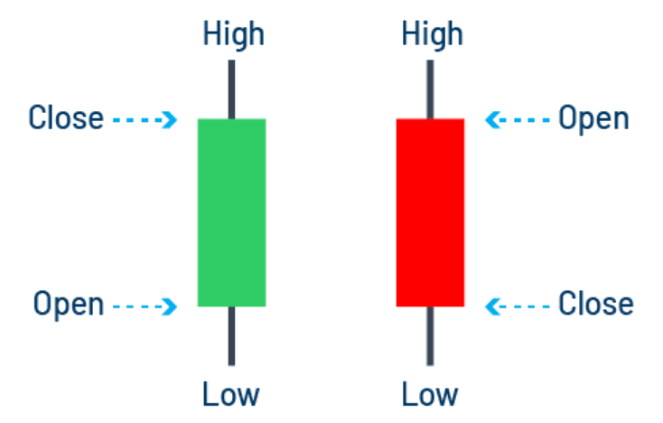Jede Kerze gibt Ihnen einen Hinweis auf das Marktsentiment. Wenn der Schluss einer Kerze höher ist als der Eröffnungspreis, wird sie als bullische Kerze betrachtet und mit grüner Farbe dargestellt. Sie zeigt an, dass die Käufer die Kontrolle haben. Umgekehrt, wenn der Schlusskurs unter dem Eröffnungspreis liegt, zeigt dies, dass die Verkäufer die Kontrolle haben, und die Farbe der Kerze ist rot.